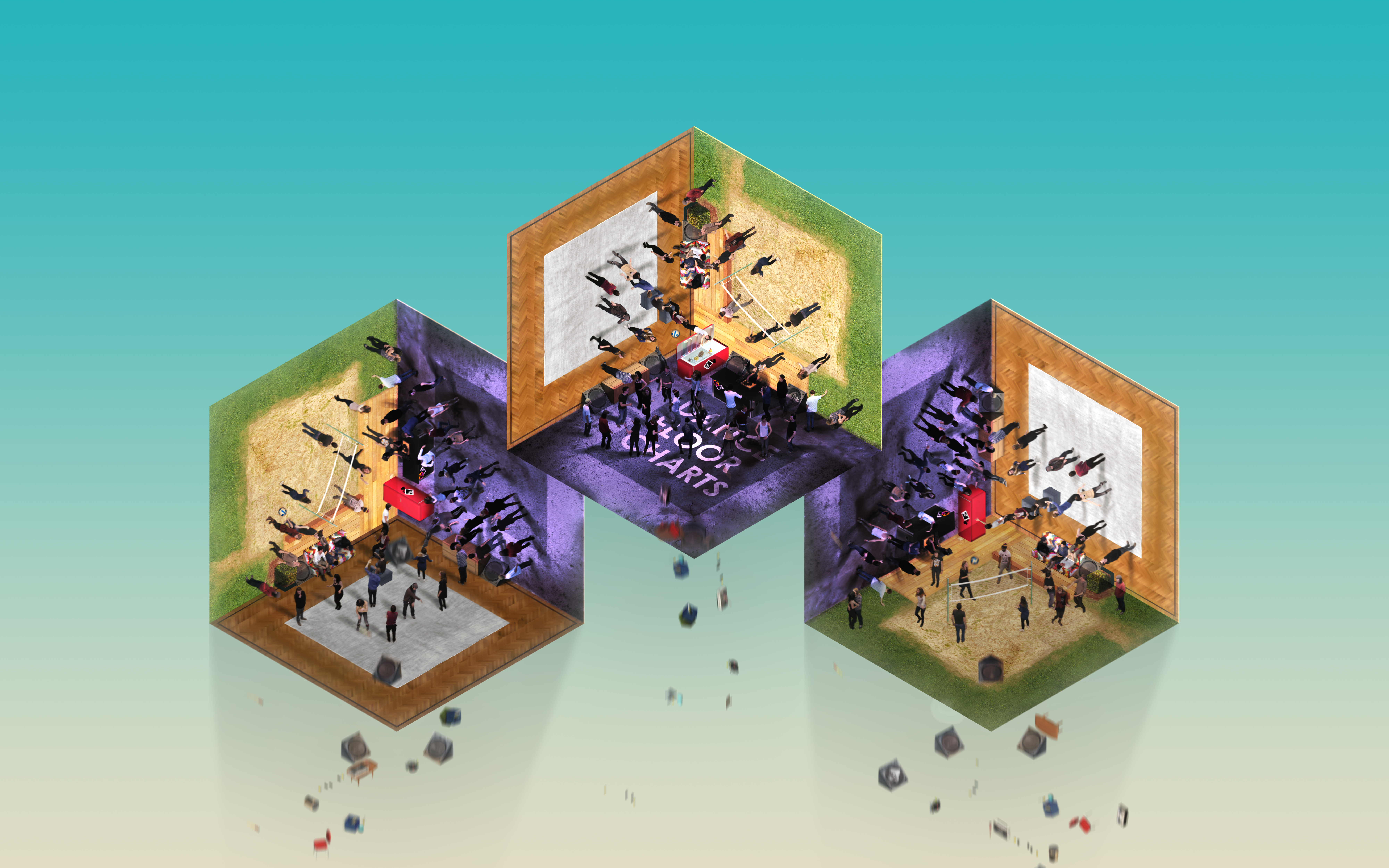 with the preparty, dancefloor and afterparty using a rotating, photorealistic but